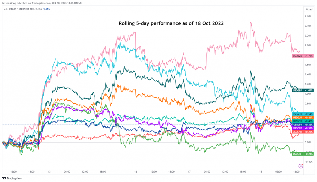 الشكل 1: أداء أزواج الدولار الأمريكي الرئيسية لمدة 5 أيام اعتبارا من 18 أكتوبر 2023 (المصدر: TradingView ، انقر لتكبير الرسم البياني)
