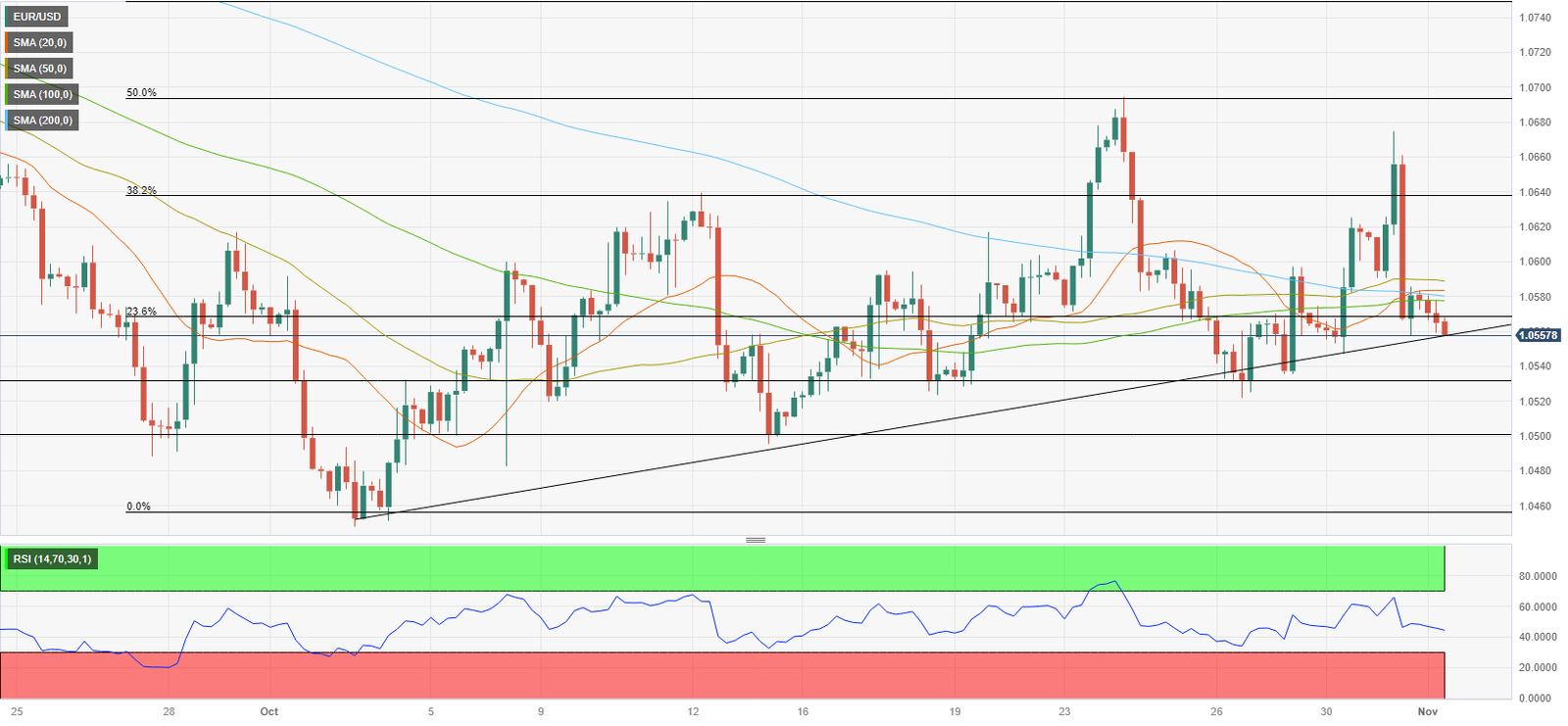 من المتوقع على نطاق واسع أن يترك البنك الاحتياطي الفيدرالي Fed معدل الفائدة في سياسته دون تغيير عند نطاق 5.25% - 5.5%. سوف يقوم المستثمرون بفحص بيان السياسة وتعليقات رئيس مجلس الإدارة جيروم باول بحثًا عن أدلة جديدة فيما يتعلق بتحركات السياسة التالية. على الرغم من أن ملخص التوقعات الاقتصادية المنقح SEP في سبتمبر / أيلول أظهر أن غالبية صناع السياسات رأوا أنه من المناسب رفع معدل الفائدة مرة أخرى قبل نهاية العام، إلا أن أداة FedWatch التابعة لمجموعة CME تشير إلى احتمالية بنسبة 73٪ بأن البنك الاحتياطي الفيدرالي Fed سوف يحافظ على الوضع الراهن في السياسة في عام 2023.