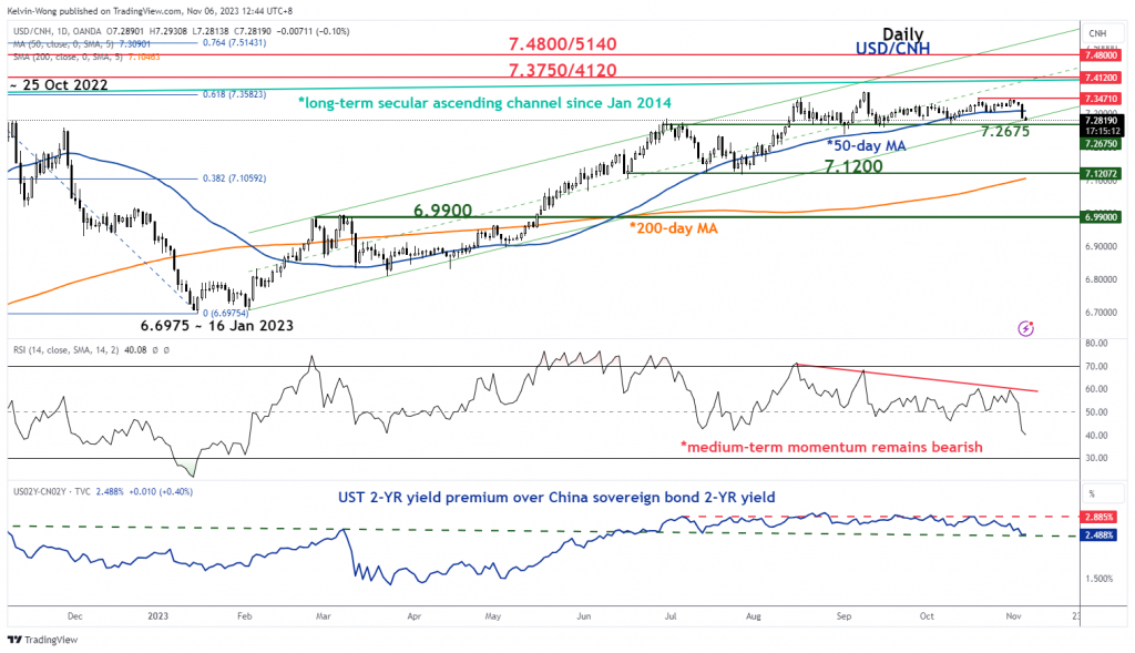 الشكل 1: الاتجاه متوسط المدى لزوج الدولار الأمريكي / اليوان الصيني اعتبارا من 6 نوفمبر 2023 (المصدر: TradingView ، انقر لتكبير الرسم البياني)