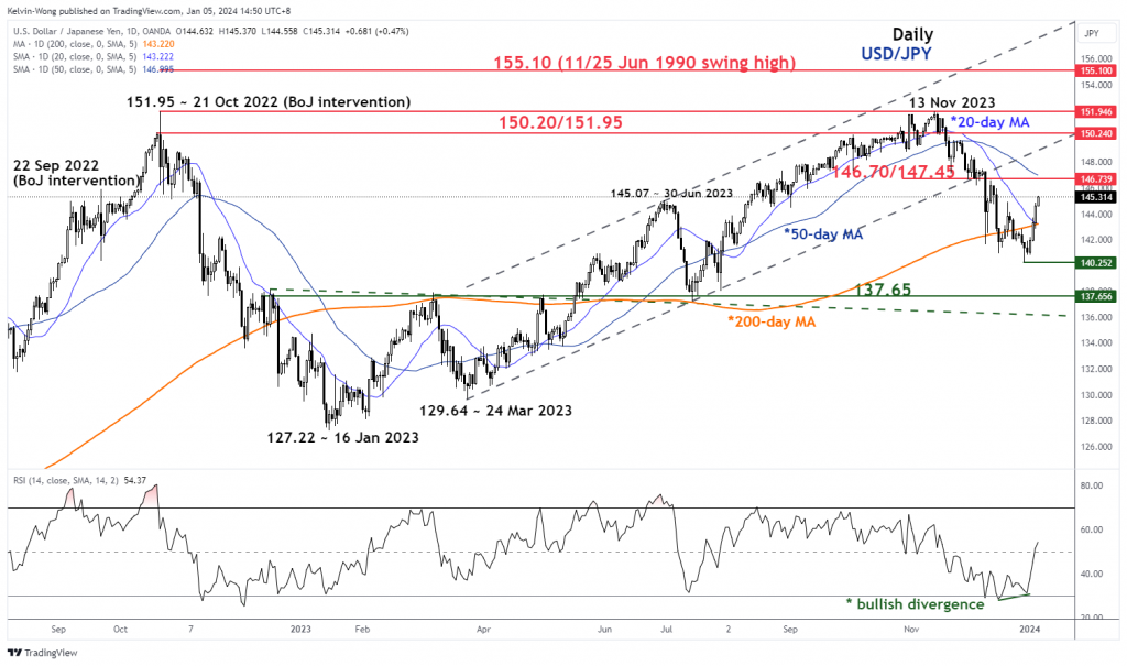 الشكل 2: الاتجاه متوسط المدى لزوج دولار أمريكي / ين ياباني اعتبارا من 5 يناير 2024 (المصدر: TradingView ، انقر لتكبير الرسم البياني)