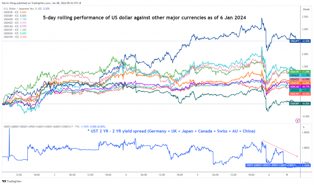 تبددت قوة الدولار الأمريكي بعد صدور تقرير الوظائف غير الزراعية حيث انخفض زوج الدولار الأمريكي / الين الياباني (أقوى أداء متفوق للدولار الأمريكي) من ذروة + 3.5٪ التي تم تسجيلها الأسبوع الماضي إلى + 2.6٪ بناء على أساس الأداء المتداول لمدة 5 أيام في هذا الوقت من كتابة هذا التقرير.