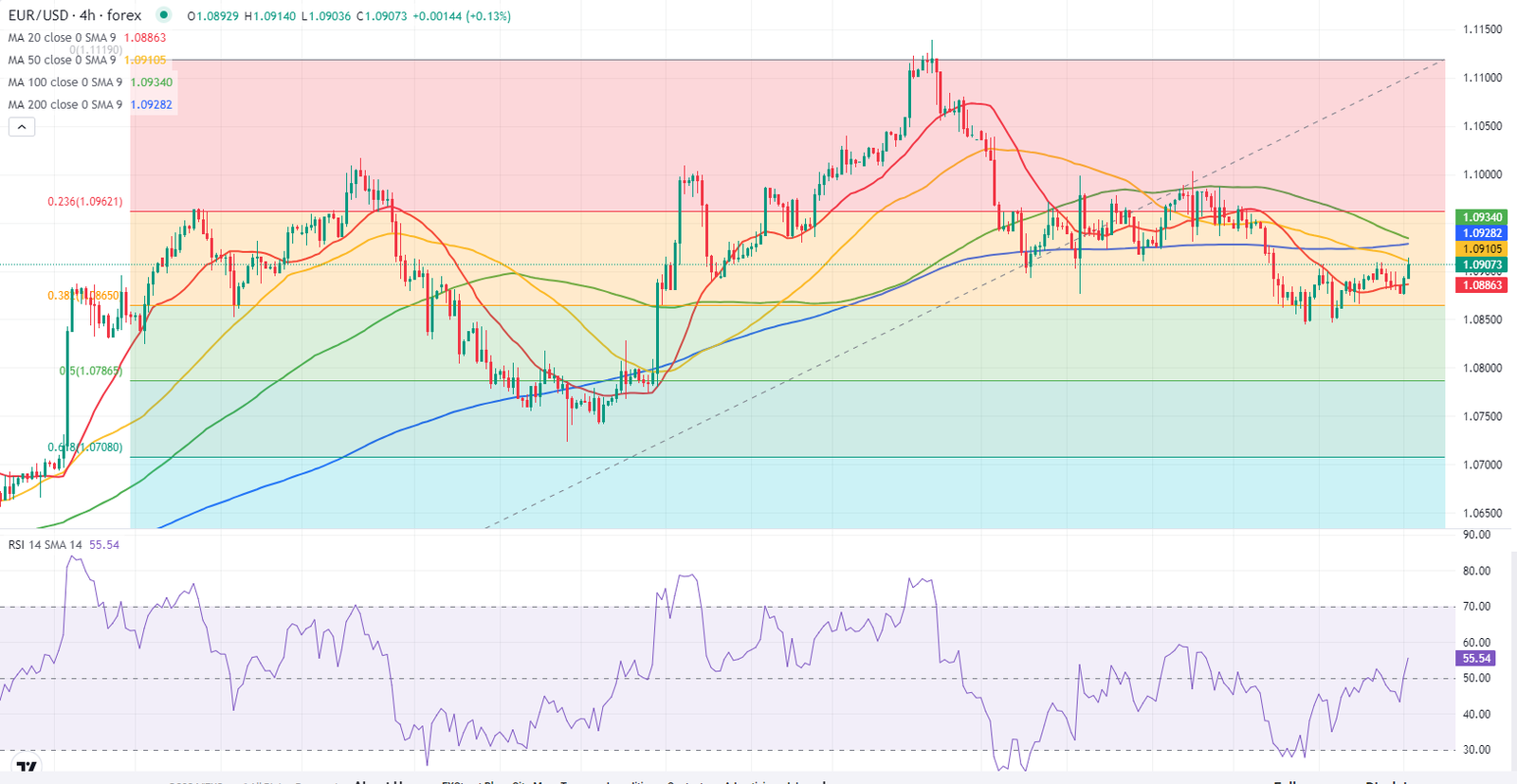 بالنظر نحو الاتجاه الهابط، يمكن رؤية مستويات الدعم عند منطقة 1.0860-1.0850 (مستويات تصحيح فيبوناتشي 38.2%، مستوى ثابت)، منطقة 1.0800 (مستوى نفسي، مستوى ثابت) ومنطقة 1.0780 (مستويات تصحيح فيبوناتشي 50%).