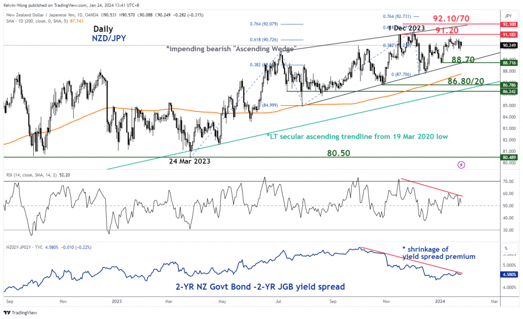 الشكل 3: الاتجاه متوسط المدى لزوج الدولار النيوزيلندي / الين الياباني اعتبارا من 24 يناير 2024 (المصدر: TradingView ، انقر لتكبير الرسم البياني)