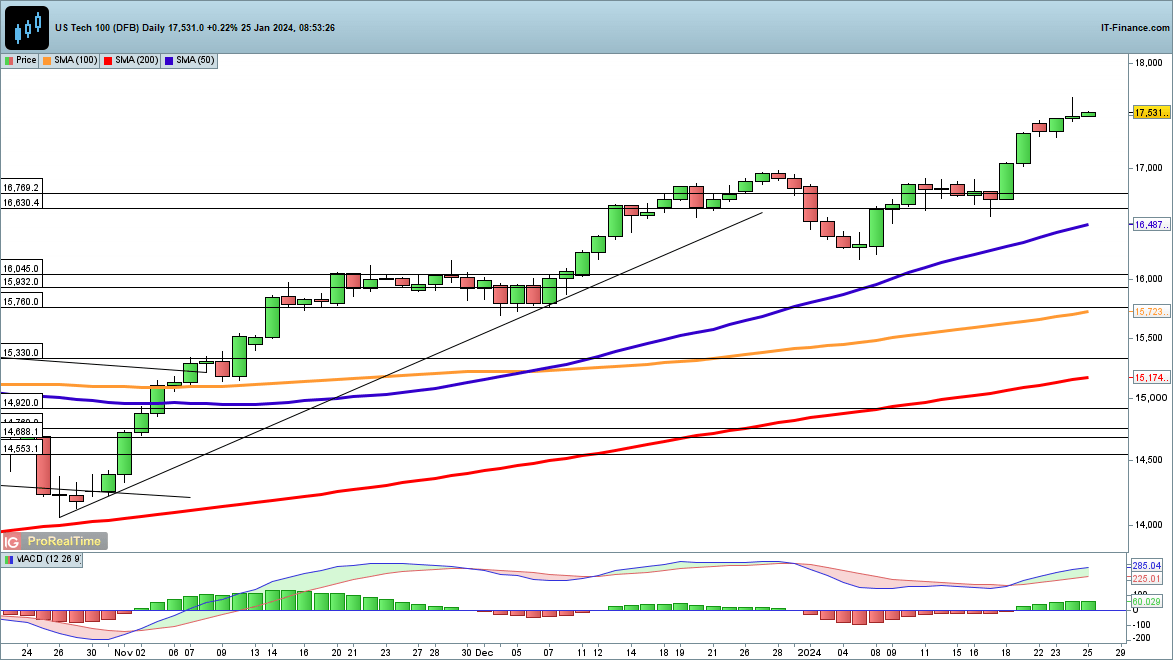 تجاهل مؤشر ناسداك 100 الأرباح الضعيفة من تسلا وارتفع في التعاملات المبكرة.شهد يوم أمس وصول المؤشر إلى مستوى قياسي جديد، مع وجود مؤشرات أقل على تراجع محتمل من مؤشر داو جونز. على المدى القريب ، قد يستمر الزخم على المدى القصير في دفع المؤشر للأعلى.
