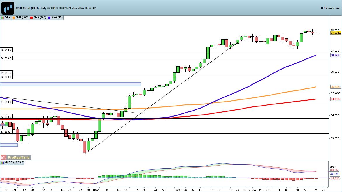 يتراجع المؤشر عن أعلى مستوى قياسي له يوم الاثنين ، ولكن مع عدم وجود علامة حتى الآن على تحرك هبوطي أكثر أهمية.قد يعمل استمرار وابل الأرباح على دفع السعر إلى الانخفاض ، وفي هذه الحالة قد توفر أدنى مستوياتها الأسبوع الماضي حول 37100 الدعم. أقل من ذلك ، يصبح المتوسط المتحرك البسيط لمدة 50 يوما (SMA) هو المنطقة التالية التي يجب مراقبتها.