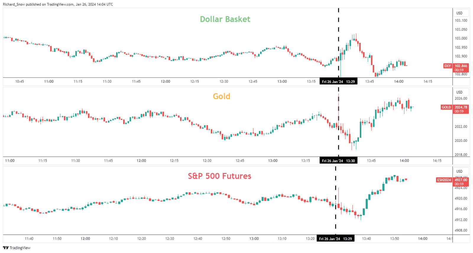 تم احتواء استجابة السوق إلى حد ما في جميع المجالات ، حيث ارتفع الدولار في البداية بشكل طفيف قبل أن يتراجع في نطاق خلال اليوم. شهد الذهب ارتفاعا واعدا بعد الإصدار مباشرة، مدعوما قليلا بعدم وجود ضغوط أسعار مقلقة وتحرك طفيف في الدولار الأمريكي.