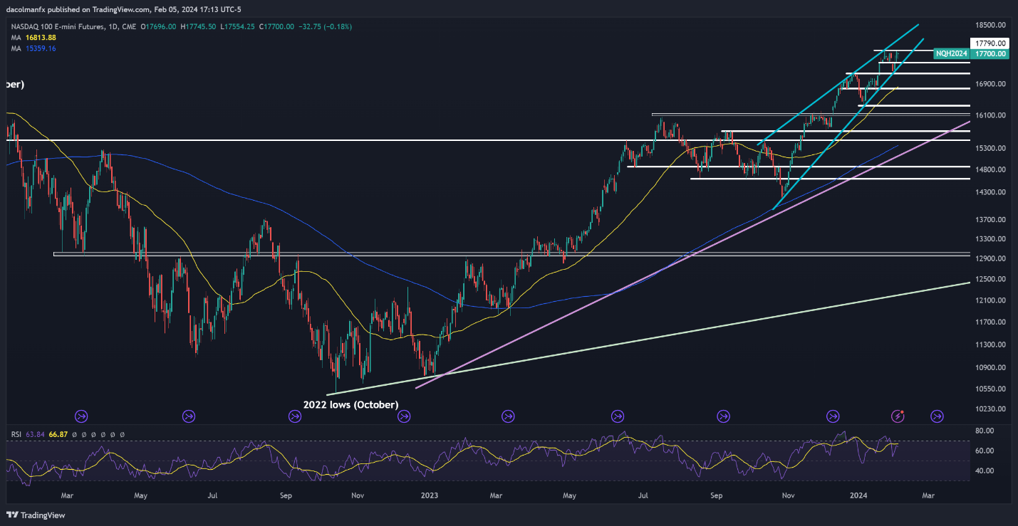 من حيث العتبات الفنية الرئيسية ، تقع المقاومة الأولى للمراقبة بالقرب من 17800 ، والتي تتزامن تقريبا مع أعلى مستوياتها على الإطلاق. إذا تمكن المشترون من الخروج من هذا السقف الحرج ، فقد لا يكون الارتفاع نحو 18050 بعيدا. على الجانب الآخر ، إذا تراجع مؤشر ناسداك 100 عن مركزه الحالي ، فسيرى الدعم عند 17450 ، يليه 17185. وفيما يتعلق بمزيد من الضعف، ستتركز الأضواء على مستوى 16775.