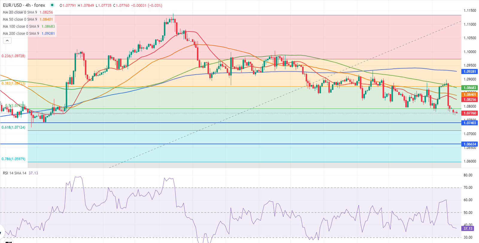 انخفض مؤشر القوة النسبية RSI على الرسم البياني لإطار 4 ساعات إلى ما دون مستويات 40، مما يشير إلى أن الزوج لديه مجال أكبر للانخفاض قبل أن يتحول إلى حالة التشبع البيعي من الناحية الفنية. تظهر منطقة 1.0740 (مستوى ثابت) بمثابة منطقة دعم مؤقتة قبل منطقة 1.0700 (مستوى نفسي، مستويات تصحيح فيبوناتشي 61.8% للاتجاه الصاعد الأخير) ومنطقة 1.0660 (مستوى ثابت).