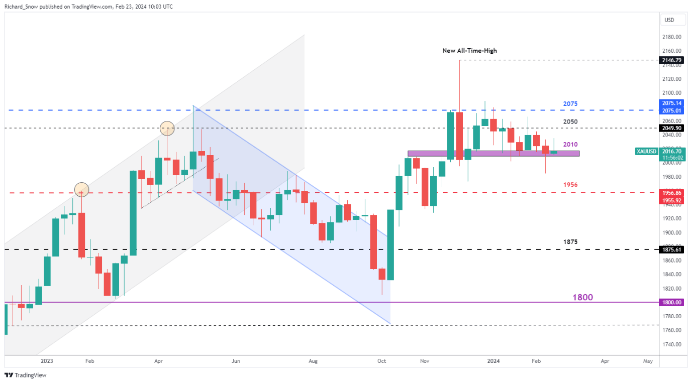 بالنظر إلى الرسم البياني الأسبوعي للذهب ، من الواضح أن أسعار الذهب قد تراجعت عن أعلى مستوى أسبوعي ، وتبدو متجهة إلى اختبار آخر لمنطقة الدعم حول عام 2010 دولار. منذ بداية العام، كانت أسعار الذهب تتجه نحو الانخفاض ولكنها تحافظ على احتمال حدوث ارتفاعات في الاتجاه الصعودي حيث يوفر المعدن الثمين جاذبية ملاذ آمن وسط التوترات الجيوسياسية المستمرة. بشكل أساسي ، تتمسك أسعار الذهب بعدد من الرياح الخلفية لعام 2024 مع جاذبيتها كملاذ آمن ، ولكن أيضا احتمال خفض أسعار الفائدة ، وانخفاض العوائد الأمريكية ، واحتمال ضعف الدولار ، كل ذلك يبشر بالخير للمعادن الثمينة.