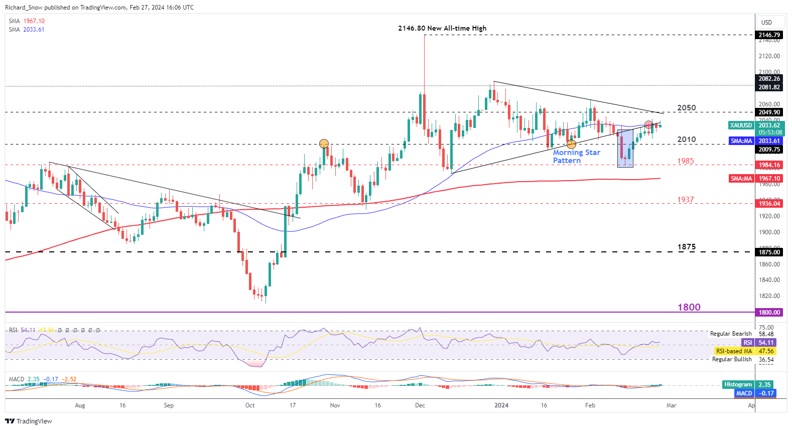 يبدو الذهب سعيدا جدا بالتتبع جنبا إلى جنب مع دعم خط الاتجاه السابق ، والآن المقاومة مع المتوسط المتحرك البسيط لمدة 50 يوما الذي يتوج الاتجاه الصعودي في الوقت الحالي. 2050 دولار هو العقبة التالية لمزيد من الاتجاه الصعودي في حين أن الدولار 2010 قد يشير إلى تراجع نحو 1985 دولار ولكن عدم وجود تقلبات يعني أن أي تحرك من المرجح أن يكون مقاسا ما لم يفاجئ الناتج المحلي الإجمالي الأمريكي للربع الرابع (التقدير الثاني) أو بيانات نفقات الاستهلاك الشخصي الجميع.