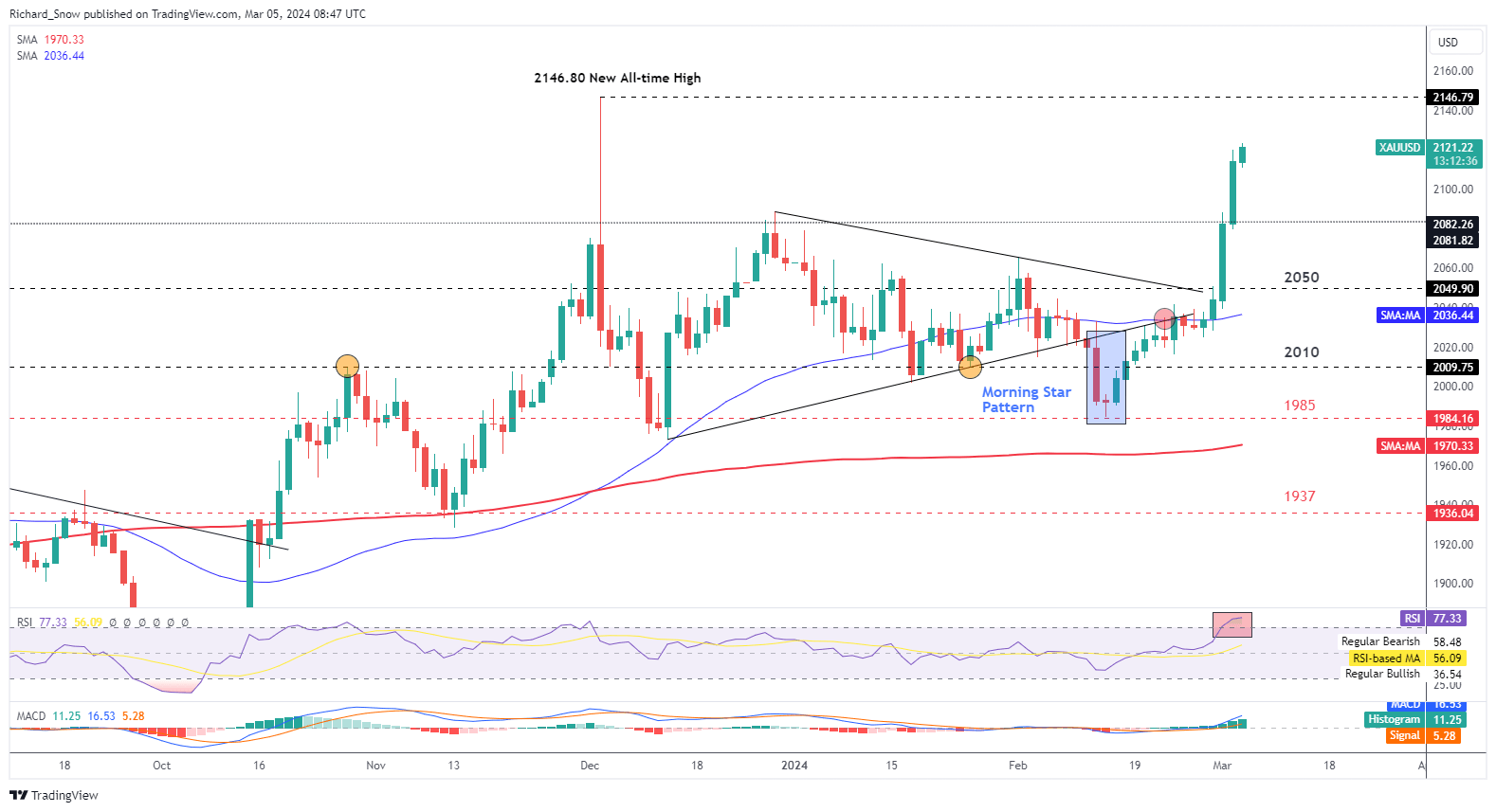 أثبت 2050 دولارا أنه مستوى مهم ، ويمثل مستوى نفسيا رئيسيا تزامن أيضا مع مقاومة خط الاتجاه. بدعم من المتوسط المتحرك البسيط لمدة 50 يوما ، تقدم XAU / USD ولم يبد أنه يتوقف. دخل مؤشر القوة النسبية في منطقة ذروة الشراء العميقة لكن أسعار الذهب أظهرت نية ضئيلة للتراجع. يقدم 2082 دولارا (أعلى مستوى سابق على الإطلاق) المستوى التالي من الدعم مع التركيز على أعلى مستوى جديد على الإطلاق عند 2146.80 دولارا كمقاومة.
