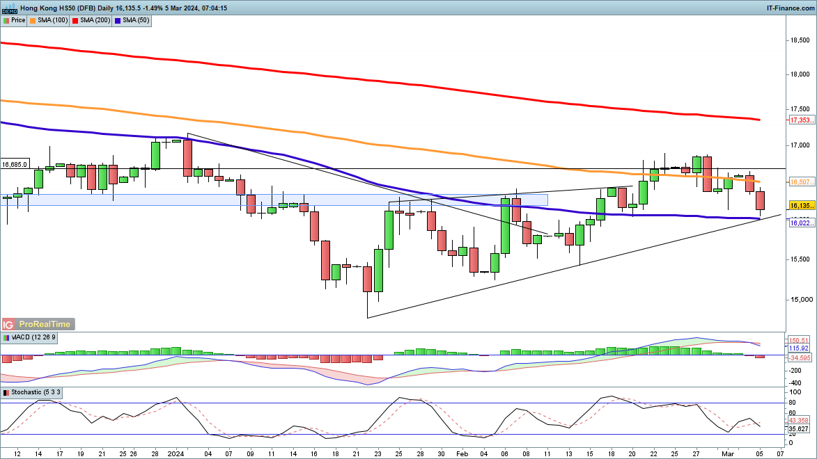 وسجل المؤشر مستوى قياسيا جديدا الأسبوع الماضي حيث ارتفع لفترة وجيزة إلى 17816 قبل أن يتراجع.وقد استمر في التحرك هبوطيا على المدى القصير ، على الرغم من أن هذا بالكاد يؤثر على المكاسب التي تحققت طوال شهر فبراير. قد يؤدي الانجراف الهبوطي الثابت ، إلى جانب تقاطع MACD الهبوطي ، إلى التعجيل بالتراجع بمرور الوقت إلى المتوسط المتحرك البسيط الصاعد لمدة 50 يوما (SMA) ، كما حدث خلال شهر ديسمبر.