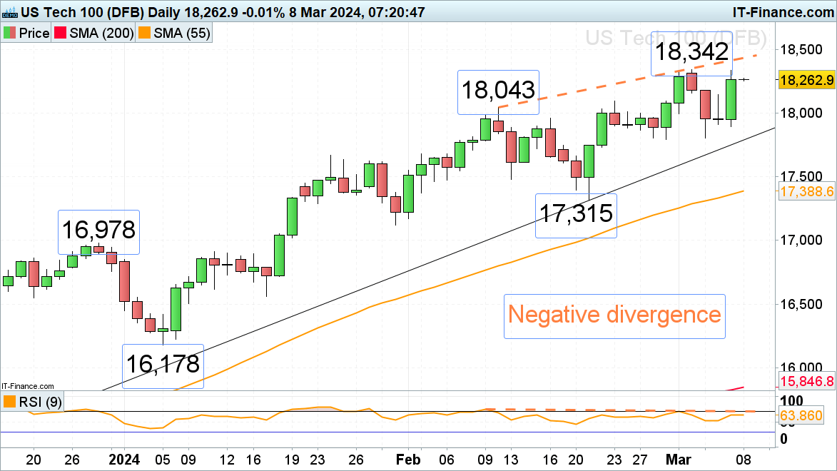 ارتفع مؤشر ستاندرد آند بورز 500 مرة أخرى وسط توقعات خفض أسعار الفائدة والمخاطرة على المعنويات حيث وصل إلى مستوى قياسي آخر، هذه المرة عند 5165. علاوة على ذلك تقع منطقة 5200.يمكن العثور على الدعم بين أعلى مستوى يوم الأربعاء 5128 وأعلى مستوى في 23 فبراير عند 5111.
