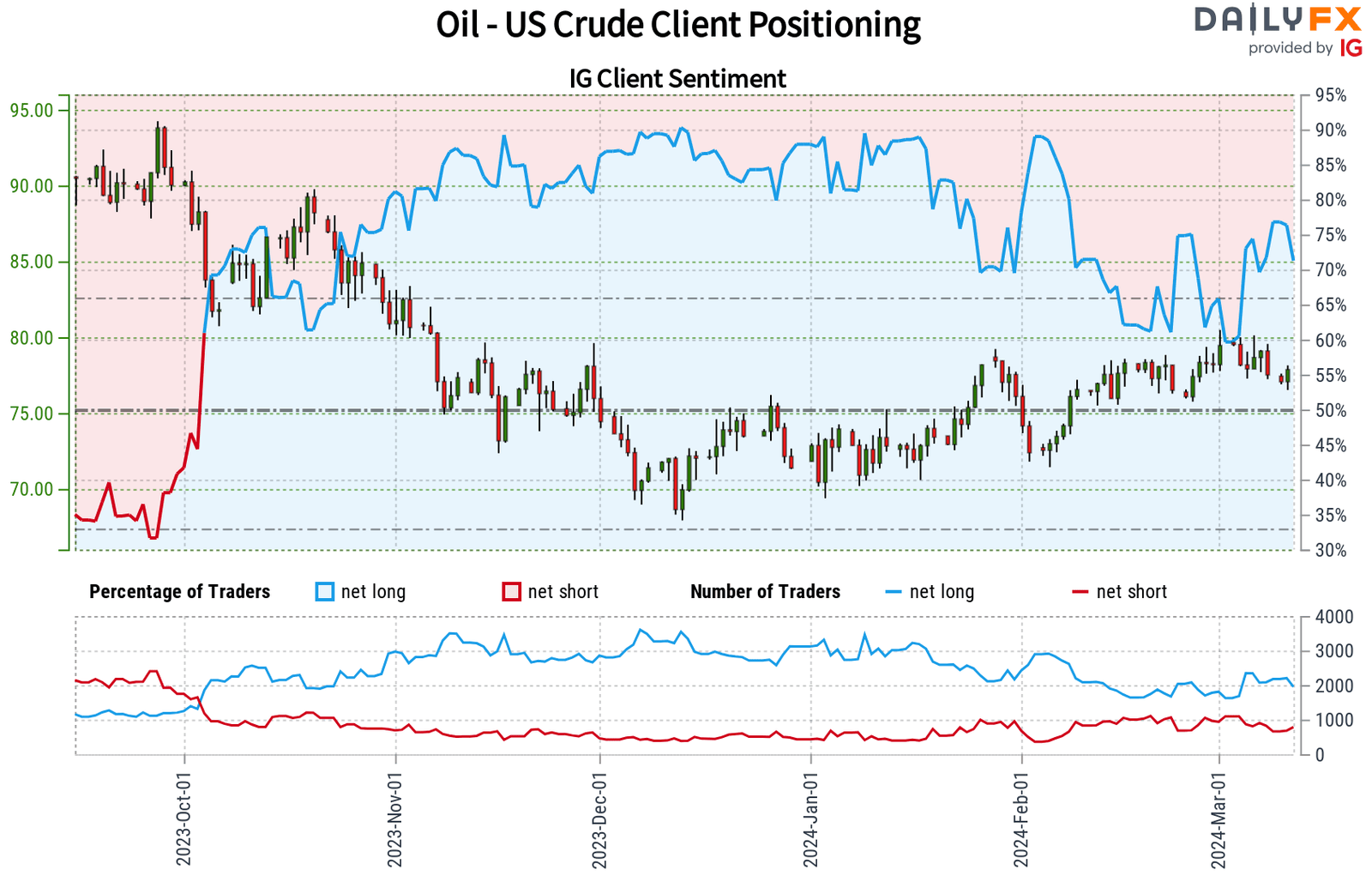 غالبا ما نتبنى موقفا متناقضا تجاه معنويات الحشد، ويشير المركز الصافي الطويل السائد بين المتداولين إلى انخفاض محتمل في أسعار النفط في المستقبل القريب. تؤكد هذه الملاحظة على أهمية الاستفادة من رؤى السوق للتنقل في تحركات السوق المحتملة بشكل فعال.