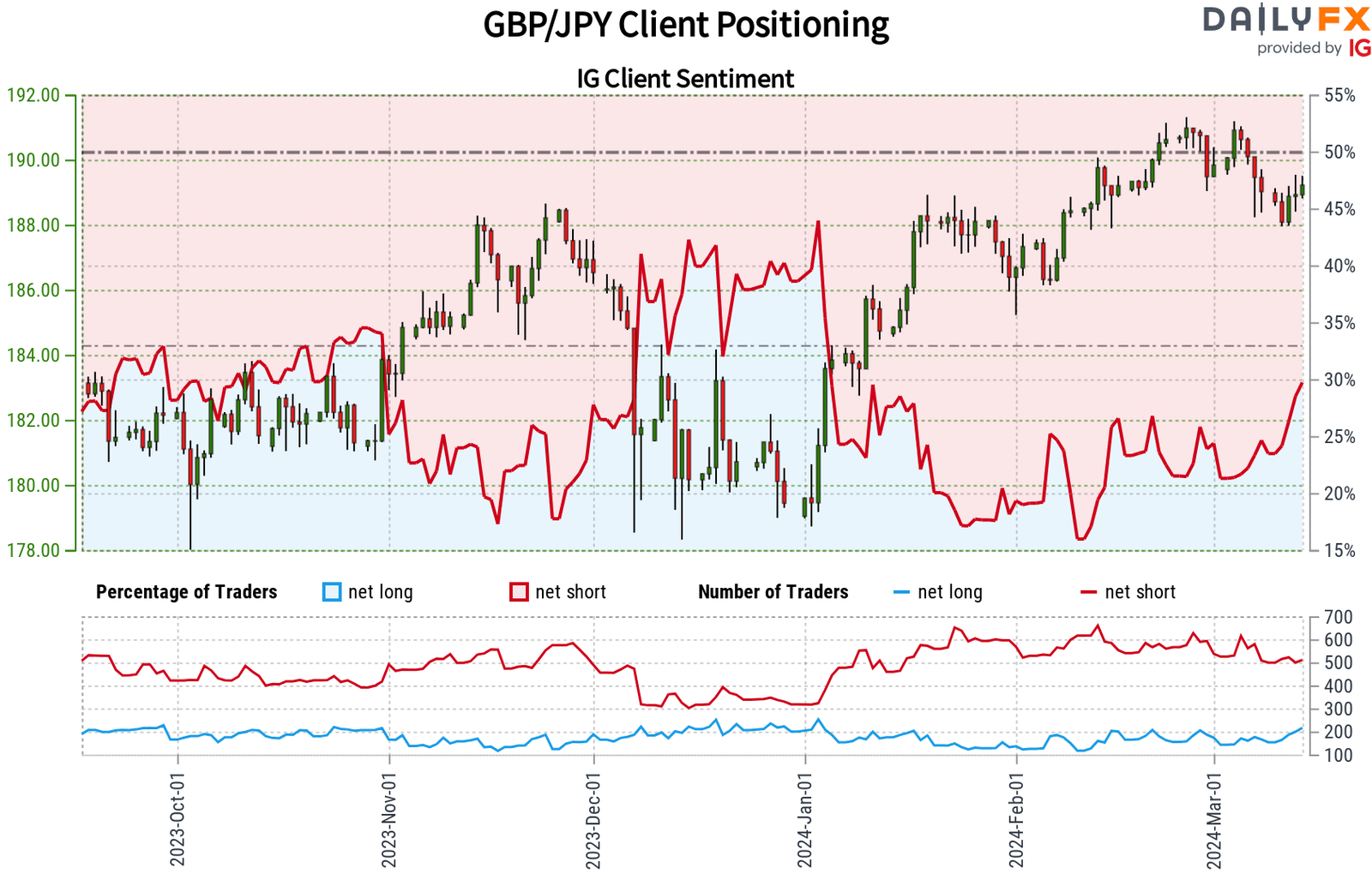 يتوقع غالبية عملاء التجزئة IG انخفاضا في GBP / JPY ، حيث يحتفظ ما يقرب من 70٪ بمراكز بيع صافية. يتم تعزيز هذا الشعور السلبي من خلال نسبة قصيرة إلى طويلة من 2.27 إلى 1.