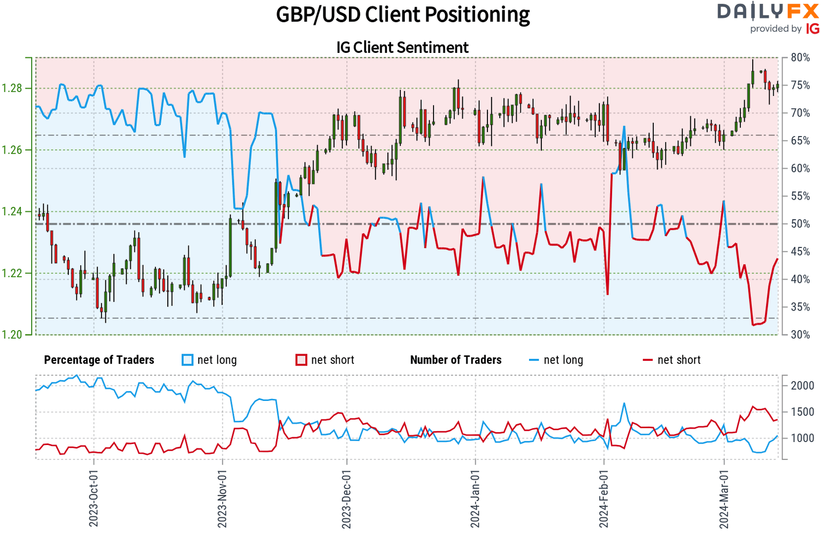 يميل متداولو التجزئة IG إلى الاتجاه الهبوطي على GBP / USD ، حيث يحتفظ 56.31٪ بمراكز بيع صافية. هذا التشاؤم واضح في نسبة قصيرة إلى طويلة من 1.29 إلى 1.