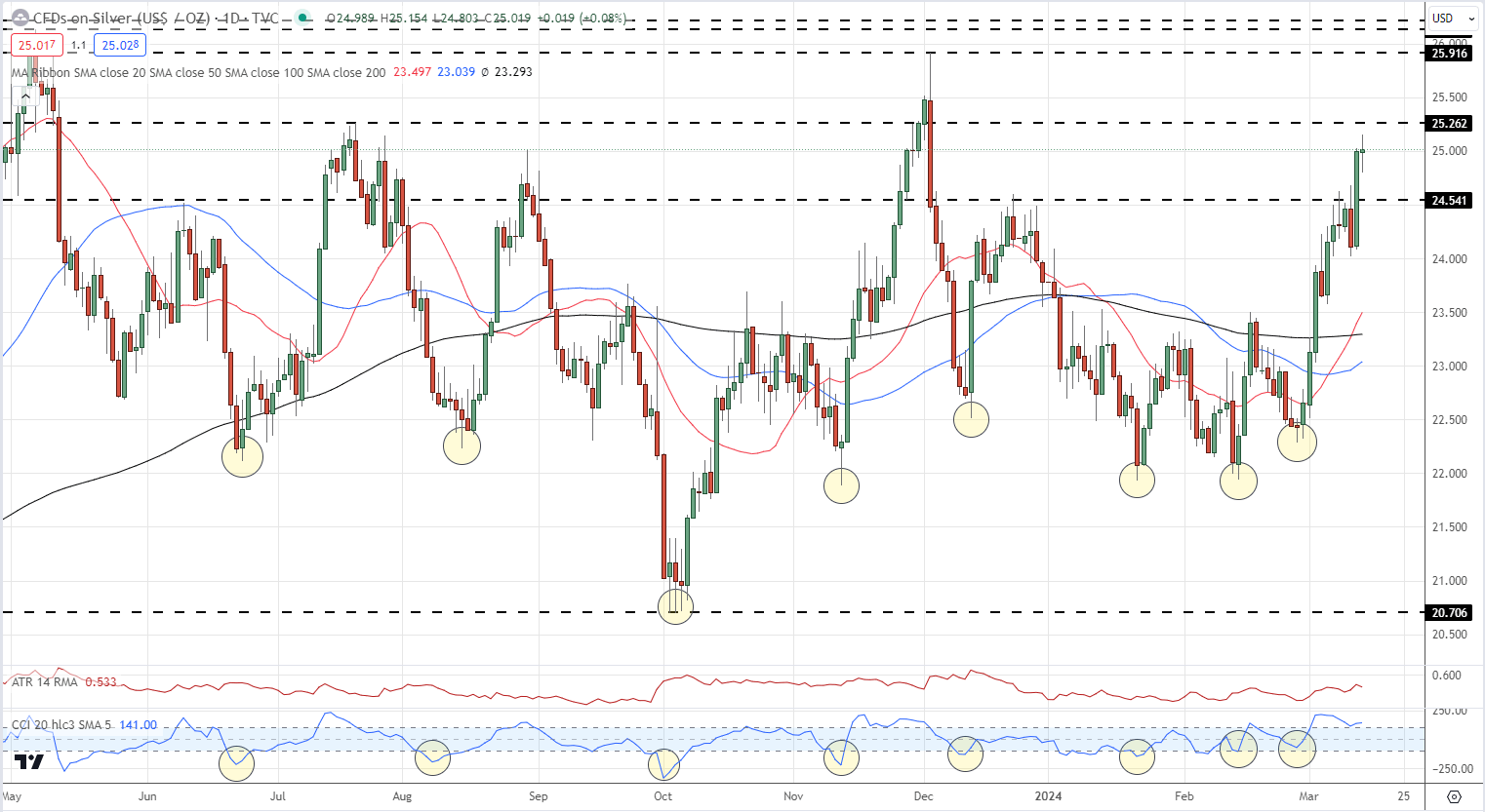 كانت الفضة في حالة جيدة منذ نهاية فبراير مع الارتفاع الحاد يوم أمس الذي دفعها إلى أعلى مستوياتها التي شوهدت آخر مرة في أوائل ديسمبر من العام الماضي. لاحظنا مؤخرا أن سوق الفضة قد أصبح في ذروة البيع بشكل كبير باستخدام مؤشر CCI ، مما يسلط الضوء مرة أخرى على التحرك الصعودي في المعدن الثمين. ينظر إلى المقاومة عند 25.26 دولارا قبل 25.92 دولارا وقد يكون من الصعب التغلب على هذا المستوى الثاني قريبا. الدعم الأولي عند 24.54 دولارا.