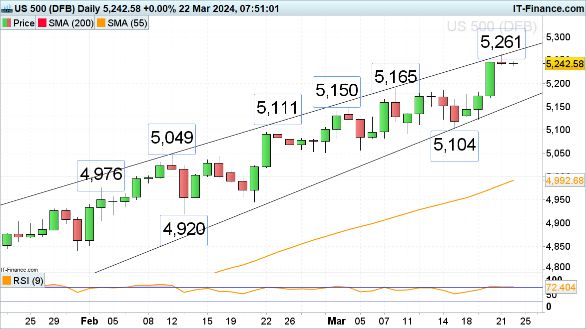 ارتفع مؤشر S&P 500 إلى مستوى قياسي آخر ، هذه المرة عند 5261 ، وهو ارتفاع من شأنه أن يضع علامة 5300 على البطاقات.يمكن رصد دعم طفيف دون مستوى 5200 عند أعلى مستوى عند 5165 في أوائل مارس.