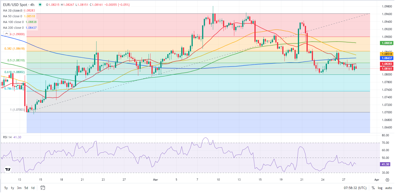 تعرض زوج يورو/دولار EUR/USD لضغوط هبوطية طفيفة وانخفض نحو منطقة 1.0800 خلال الجلسة الأوروبية المبكرة يوم الخميس. تشير التوقعات الفنية على المدى القريب إلى أن التحيز الهبوطي لا يزال قائمًا ولكن حركة الزوج يمكن أن تظل هادئة مع اقتراب عطلة عيد الفصح.