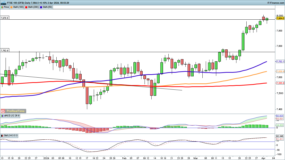 يبدأ المؤشر الشهر والربع الجديد بالقرب من مستوى 8000 ، بعد انتعاش مثير للإعجاب من أدنى مستوياته في يناير.الارتفاع القياسي من فبراير 2023 عند 8045 يلوح الآن في الأفق ، على الرغم من أن السعر قد انخفض أيضا إلى ما دون أعلى مستوى 7976 من مارس من العام الماضي.