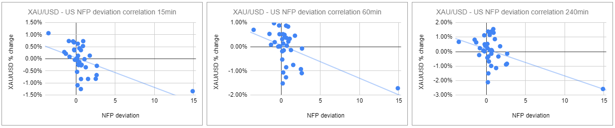 لقد رسمنا رد فعل سعر الذهب على قراءة الوظائف غير الزراعية NFP في خلال 15 دقيقة وساعة وأربع ساعات بعد الإصدار. بعد ذلك، قارنا رد فعل سعر الذهب بالانحراف بين نتيجة إصدار الوظائف غير الزراعية الفعلية والنتيجة المتوقعة.