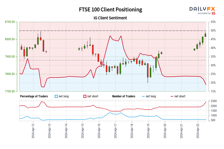 FTSE 100 IG Client Sentiment: Our data shows traders are now at their least net-long FTSE 100 since Apr 12 when FTSE 100 traded near 7,927.50.