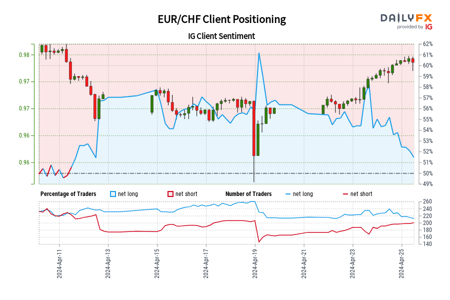 تظهر بياناتنا أن المتداولين أصبحوا الآن على بيع صافي اليورو مقابل الفرنك السويسري للمرة الأولى منذ 11 أبريل 2024 عندما تم تداول اليورو مقابل الفرنك السويسري بالقرب من 0.98. أصبح المتداولون أكثر صافي بيع من الأمس والأسبوع الماضي ، ومزيج من المعنويات الحالية والتغييرات الأخيرة يمنحنا تحيزا أقوى للتداول المعاكس الصعودي لزوج اليورو / الفرنك السويسري.