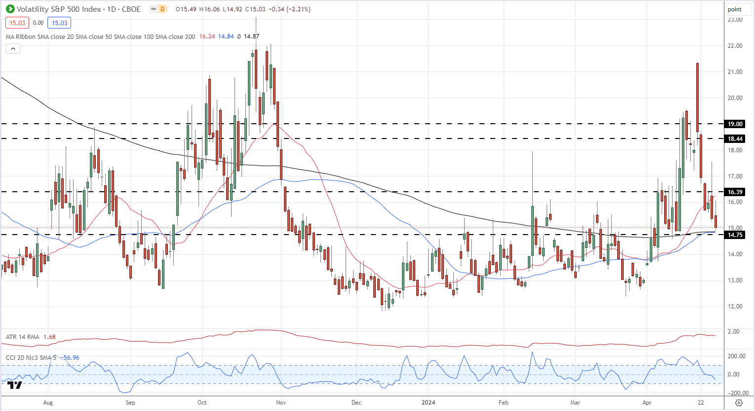 كان أسبوعا محفوفا بالمخاطر بالنسبة لمعظم الأسواق حيث تراجعت الأعمال العدائية بين إسرائيل وإيران في عطلة عيد الفصح. يبدو الهجوم الإيراني الأخير بطائرة بدون طيار على إسرائيل الآن في مرآة الرؤية الخلفية على الرغم من أن إسرائيل لا تزال تتحدث عن مزيد من الانتقام ، فإن الهدوء الحالي قد لا يستمر لفترة أطول. يسلط الرسم البياني اليومي لمؤشر VIX الضوء على معنويات المخاطرة الأسبوع الماضي مع بيع أعلى مستوى في 19 شهرا يوم الجمعة عند 21.36 بكثافة. أنهى مؤشر VIX الأسبوع عند 15.03.