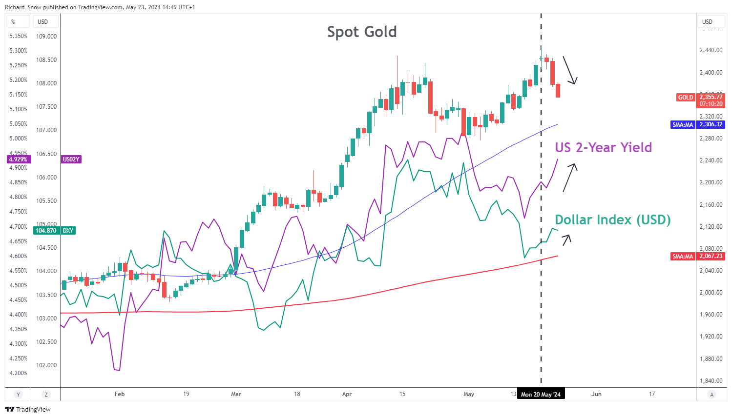 ونتيجة لذلك، ارتفع عائد سندات الخزانة الحساسة لأجل 2 عاما، كما فعل الدولار الأمريكي - مما أثر على المعدن الثمين كما هو موضح أدناه.