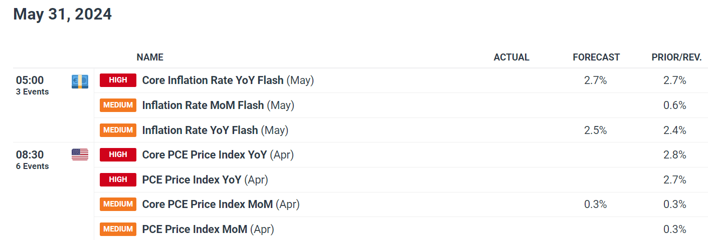 مع تقدمنا خلال الأسبوع ، نتوقع فترة هادئة نسبيا مع عدد قليل من الأحداث عالية التأثير التي من المحتمل أن تثير تقلبات كبيرة. ومع ذلك ، يمكن أن يتغير المشهد يوم الجمعة مع صدور المؤشرات الاقتصادية الحرجة. على جانب واحد من المحيط الأطلسي ، سيتم إصدار أرقام مؤشر أسعار المستهلكين لشهر مايو في منطقة اليورو. على الجانب الآخر من البركة ، سنحصل على بيانات نفقات استهلاك الأسعار الأساسية ، وهو مقياس التضخم الأكثر مراقبة عن كثب من قبل الاحتياطي الفيدرالي.