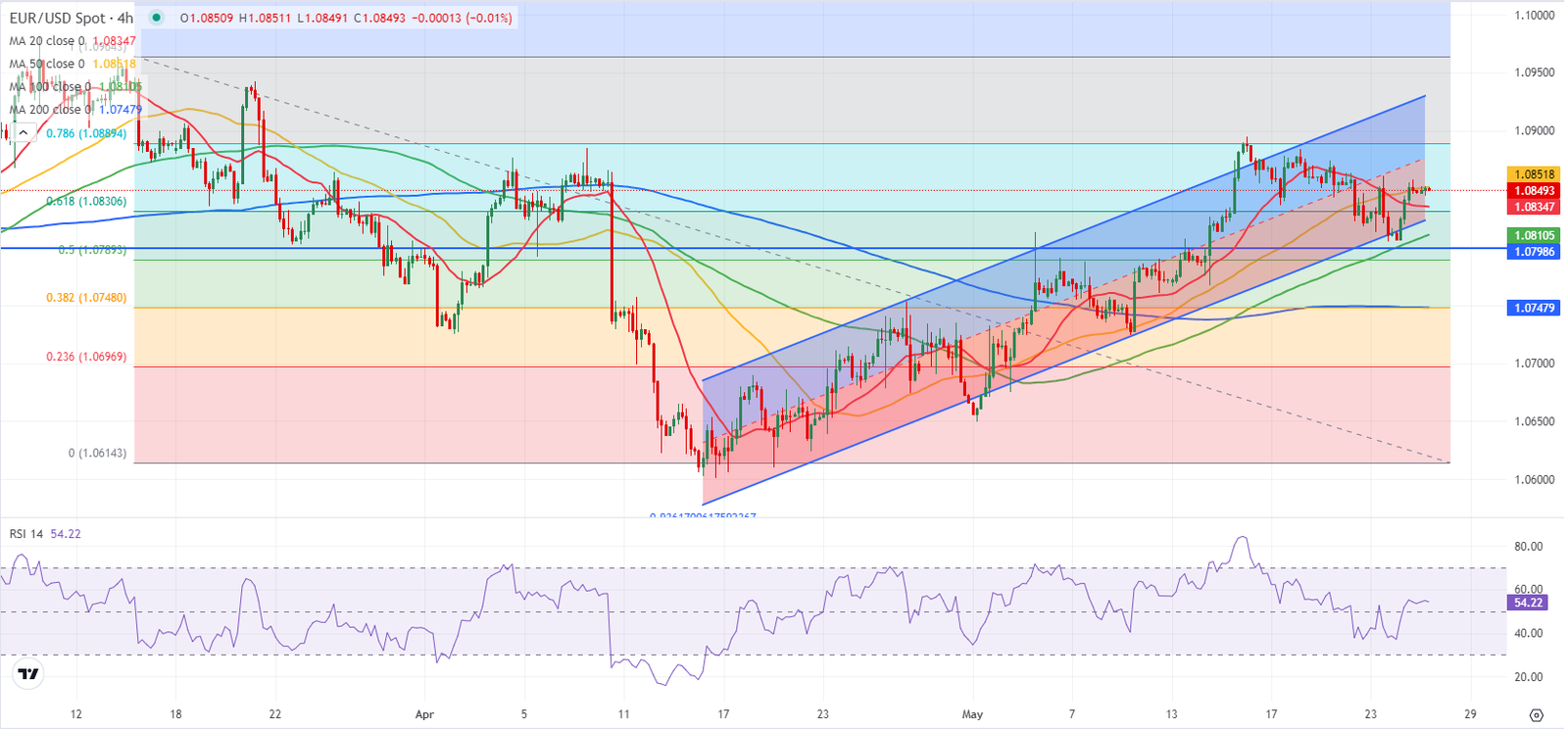 لا يزال زوج يورو/دولار EUR/USD داخل القناة السعرية الصاعدة القادمة من منتصف أبريل/نيسان. ومع ذلك، يظل مؤشر القوة النسبية RSI على الرسم البياني لإطار 4 ساعات مستقراً بشكل عرضي أعلى بقليل من مستويات 50، مما يشير إلى أن الزوج لم يكتسب زخمًا صعوديًا حتى الآن.