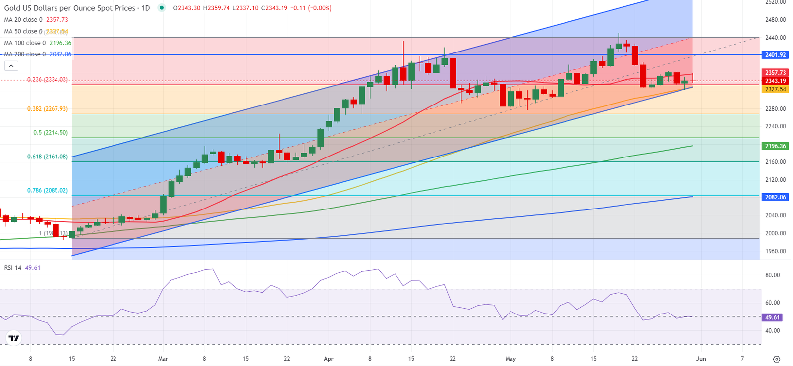 وفقًا للرسم البياني اليومي، يتحرك مؤشر القوة النسبية (RSI) عرضيًا بالقرب من مستوى 50، مما يعكس تردد الذهب.