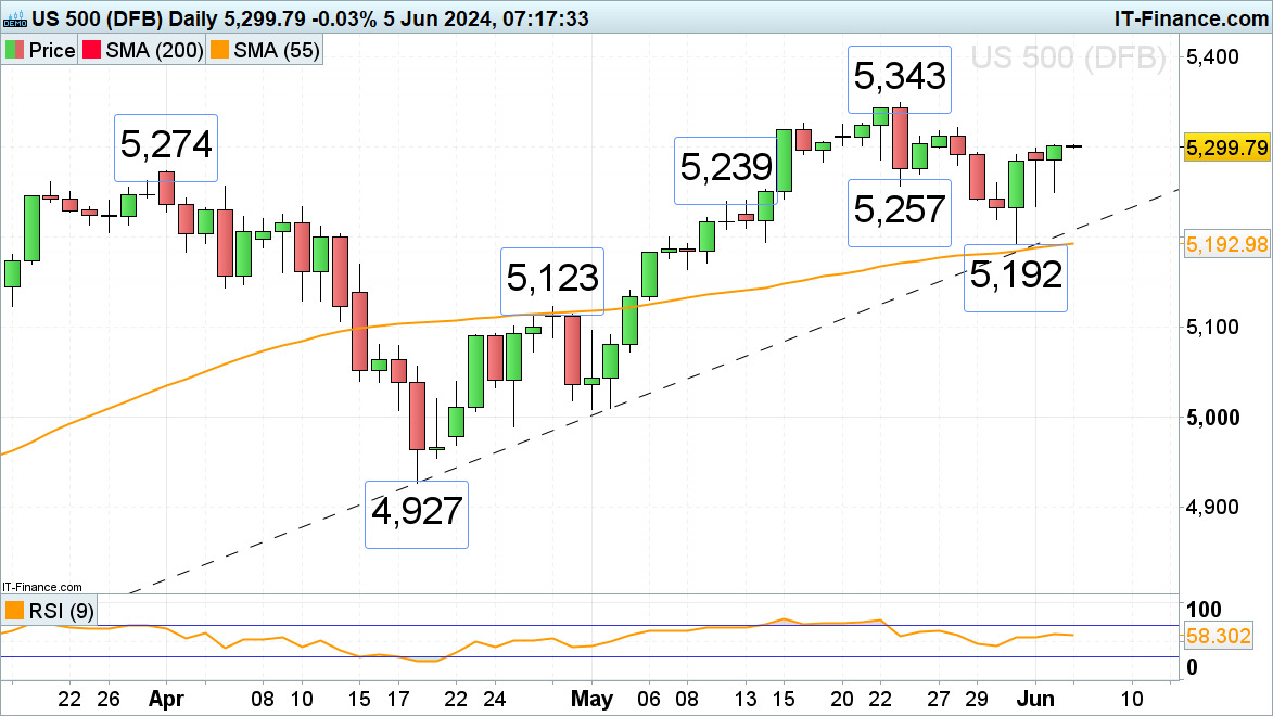 يمكن رصد دعم طفيف عند أعلى مستوى في 30 مايو عند 5260 وأدنى مستوى في 23 مايو عند 5257.