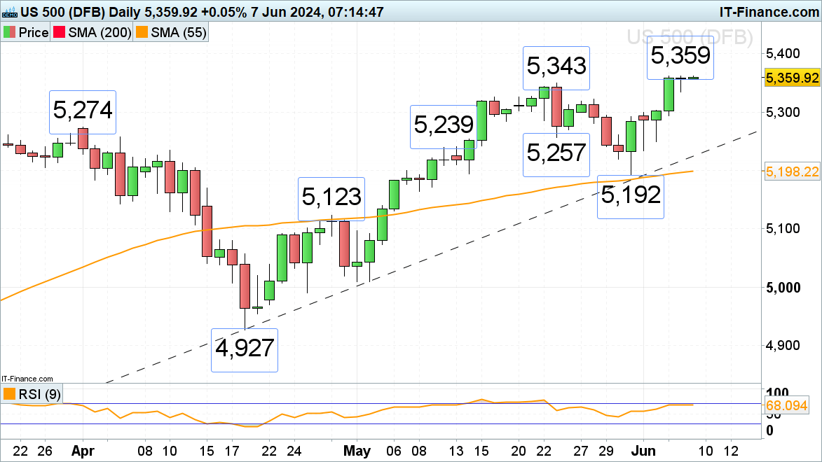 يتداول مؤشر S&P 500 في أعلى مستوياته على الإطلاق حول مستوى 5,360 قبل الوظائف غير الزراعية الأمريكية اليوم مع بقاء علامة 5,400 في الأفق، بشرط أن يكون أدنى مستوى يوم الخميس عند 5,334 يدعم. فوق هذا المستوى يمكن رؤية دعم طفيف عند ذروة 5343 مايو.