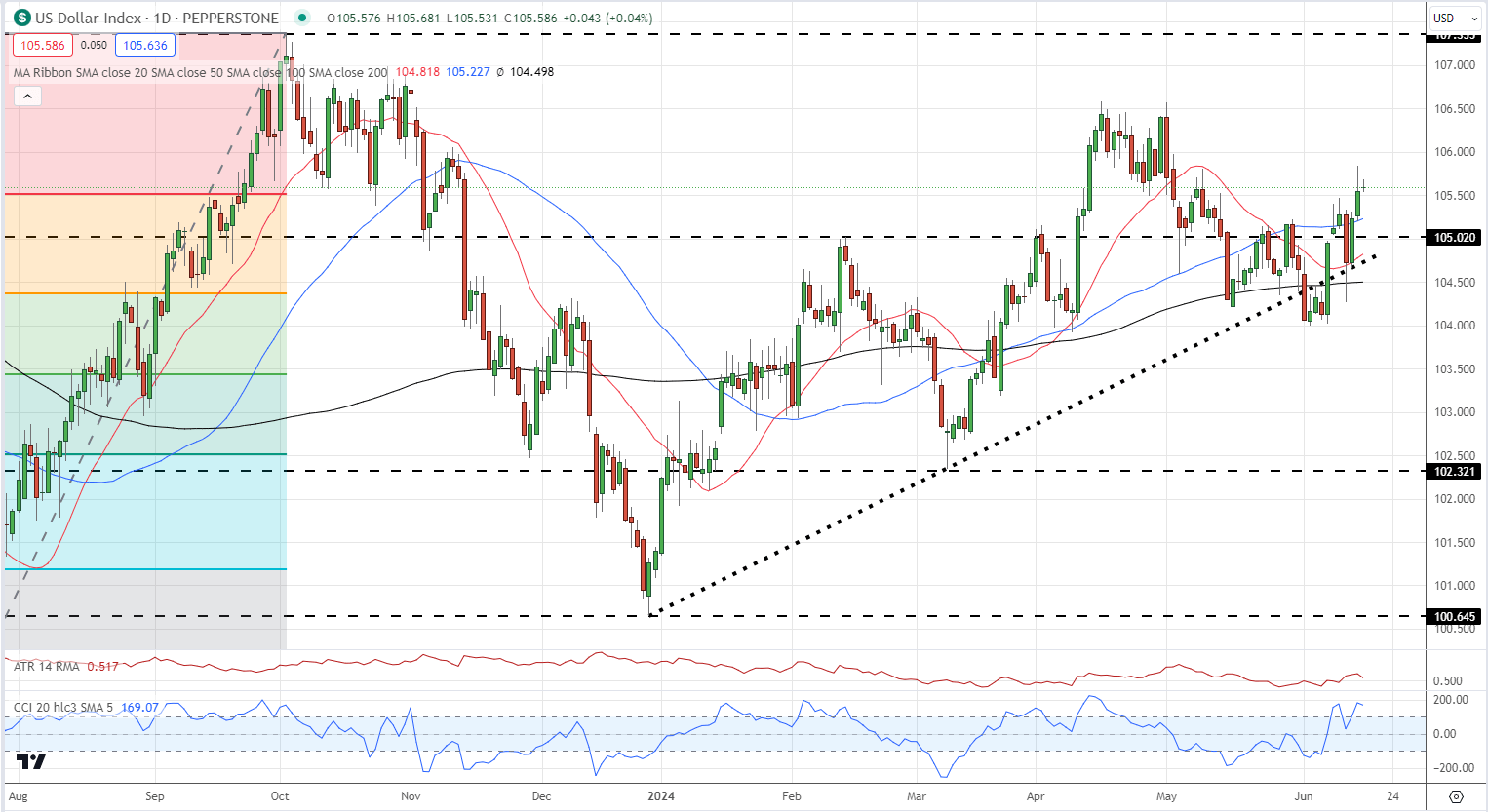 يتداول مؤشر الدولار الأمريكي حول 105.60 ويعزز حركته الأخيرة للأعلى. عاد الدولار فوق جميع المتوسطات المتحركة البسيطة الثلاثة ، وهي إشارة صعودية ، لكنه يبدو في منطقة ذروة الشراء باستخدام مؤشر CCI.