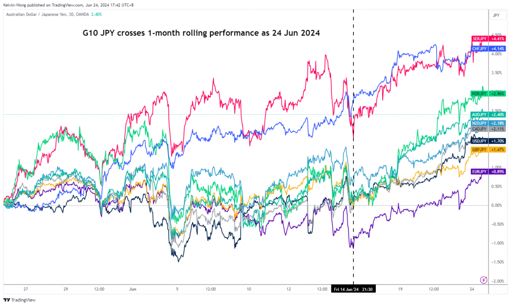 الشكل 1: شهر واحد من الأداء المتداول لأزواج G-10 JPY اعتبارا من 24 يونيو 2024 (المصدر: TradingView ، انقر لتكبير الرسم البياني)