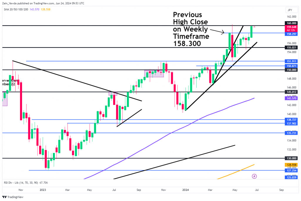 الرسم البياني الأسبوعي لزوج دولار / ين USD / JPY - 24 يونيو 2024