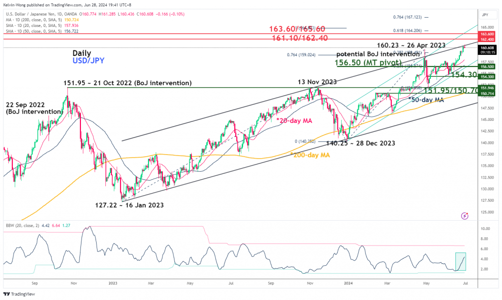 الشكل 2: الاتجاهات متوسطة الأجل والاتجاهات الرئيسية لزوج دولار أمريكي / ين ياباني اعتبارا من 28 يونيو 2024 (المصدر: TradingView ، انقر لتكبير الرسم البياني)