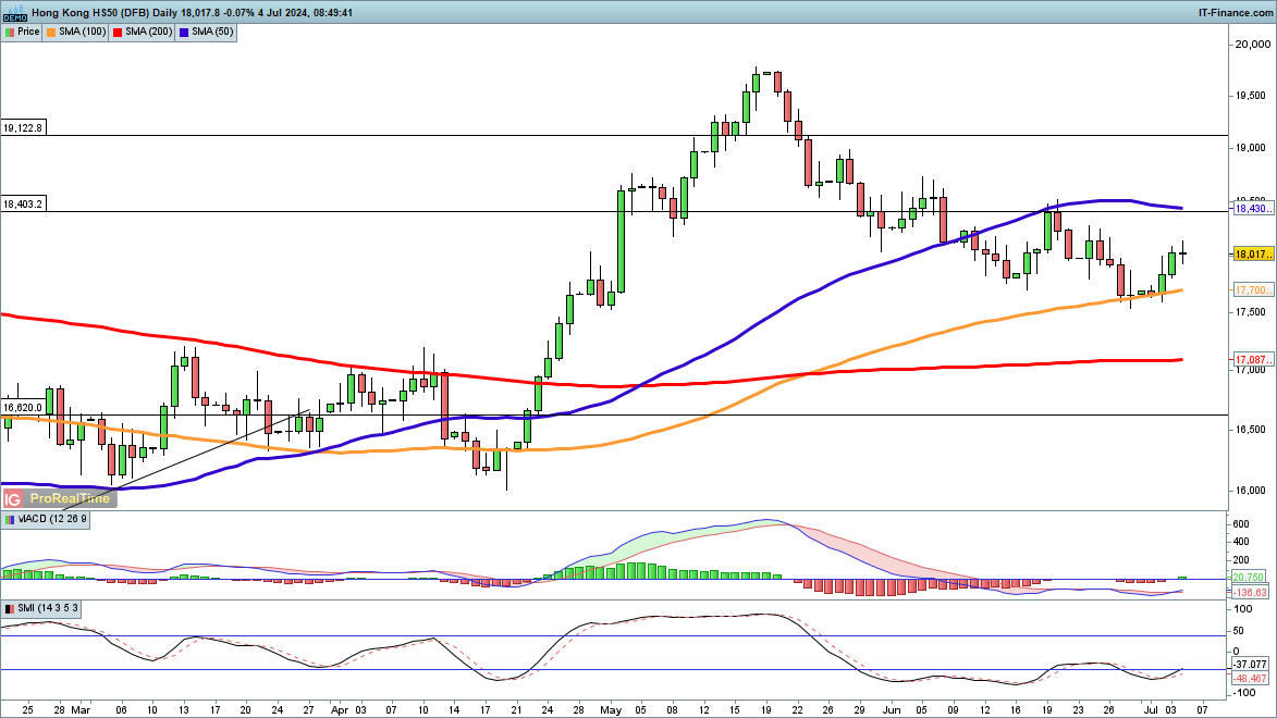 في حين ارتفع المؤشر خلال الأسبوع الماضي ، مرتدا من المتوسط المتحرك البسيط ل 100 يوم ، فمن الواضح الآن أن ارتفاعا جديدا قد بدأ.لقد شهدنا ارتدادين سابقين منذ أوائل يونيو ، وكلاهما أفسح المجال لمزيد من الخسائر. على المدى القصير ، يستهدف السعر أعلى مستوى في منتصف يونيو عند 18400 ، ثم المتوسط المتحرك البسيط لمدة 50 يوما (حاليا 18430).
