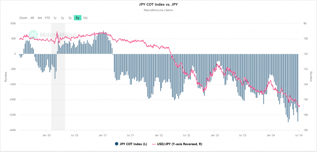 استنادا إلى أحدث بيانات التزامات المتداولين اعتبارا من 24 يونيو 2024 (التي جمعتها ماكرو مايكرو)، انخفض إجمالي صافي المراكز المفتوحة الهبوطية للمضاربين الكبار في سوق العقود الآجلة للين الياباني في الولايات المتحدة (بعد تعويض المراكز الإجمالية للمتحوطين التجاريين الكبار) منذ أواخر مايو إلى 355,758 عقدا، وهو ما يعيد النظر إلى أدنى مستوى له منذ 17 عاما تقريبا عند -359,063 عقدا مطبوعا في 22 أبريل.