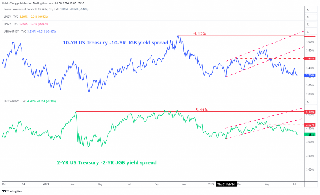 تقلص الفارق لمدة عامين و 10 سنوات بين سندات الخزانة الأمريكية و JGB إلى 4.28٪ و 3.23٪ على التوالي ، وهو أدنى مستوياته منذ أوائل فبراير 2024 (انظر الشكل 2).