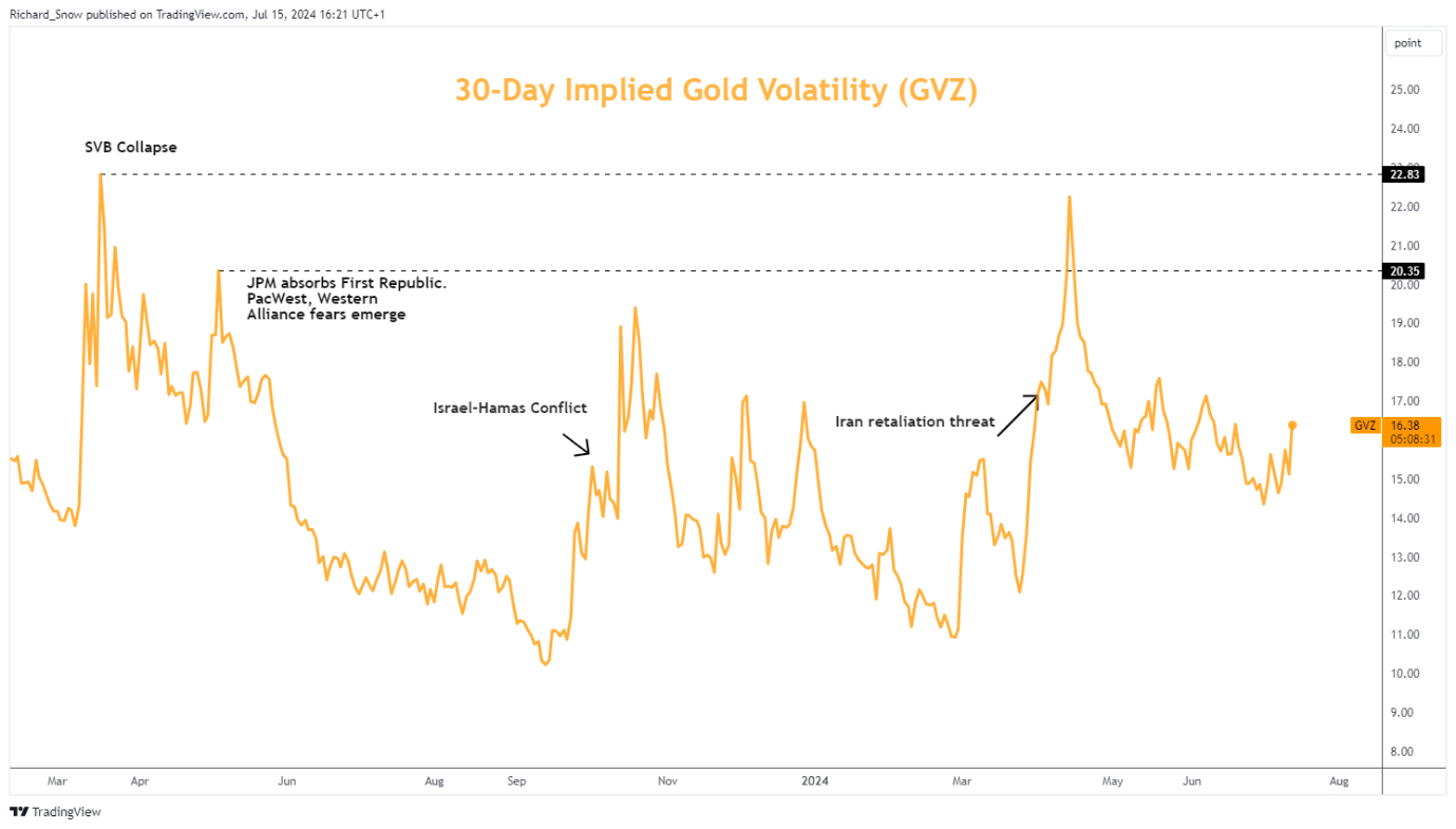 وقد هدأت تقلبات الذهب الآن بعد أن هدأت التوترات في أوروبا الشرقية والشرق الأوسط، على الرغم من استمرار القتال. ارتفع تقلب الذهب الضمني لمدة 30 يوما (GVZ) في الآونة الأخيرة ، لكن الأمر سيتطلب حافزا رئيسيا من هنا لإغراء المشترين بالعودة بطريقة ذات مغزى للحفاظ على الأسعار أعلى بكثير من أعلى مستوى لها على الإطلاق.