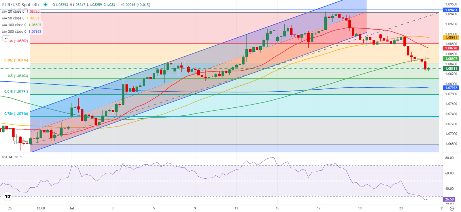 انخفض مؤشر القوة النسبية RSI على الرسم البياني لإطار 4 ساعات إلى ما دون مستويات 30، مما يُظهر حالة تشبع بيعي على المدى القريب. تظهر منطقة 1.0840-1.0850 (المتوسط المتحرك البسيط 100 فترة، مستويات تصحيح فيبوناتشي 38.2% من الاتجاه الصاعد الأخير) بمثابة منطقة مقاومة فورية قبل منطقة 1.0880 (مستويات تصحيح فيبوناتشي 23.6%) ومنطقة 1.0900 (مستوى نفسي، مستوى ثابت).