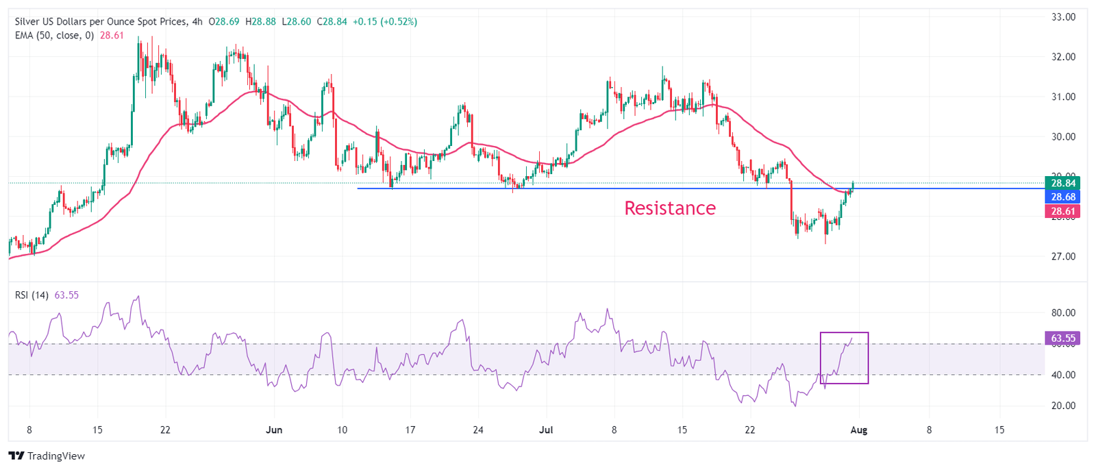 يحاول سعر الفضة استئناف انتعاشه فوق المقاومة الحاسمة التي حققها عند قاع 13 يوليو/تموز عند 28.66 دولارًا في إطار زمني مدته 4 ساعات. يتحرك المعدن الأبيض صعودًا ويستهدف الاستقرار فوق المتوسط المتحرك الأسي (EMA) لمدة 50 يوماً، والذي يتم تداوله قرابة المستوى السعري 28.60 دولار.