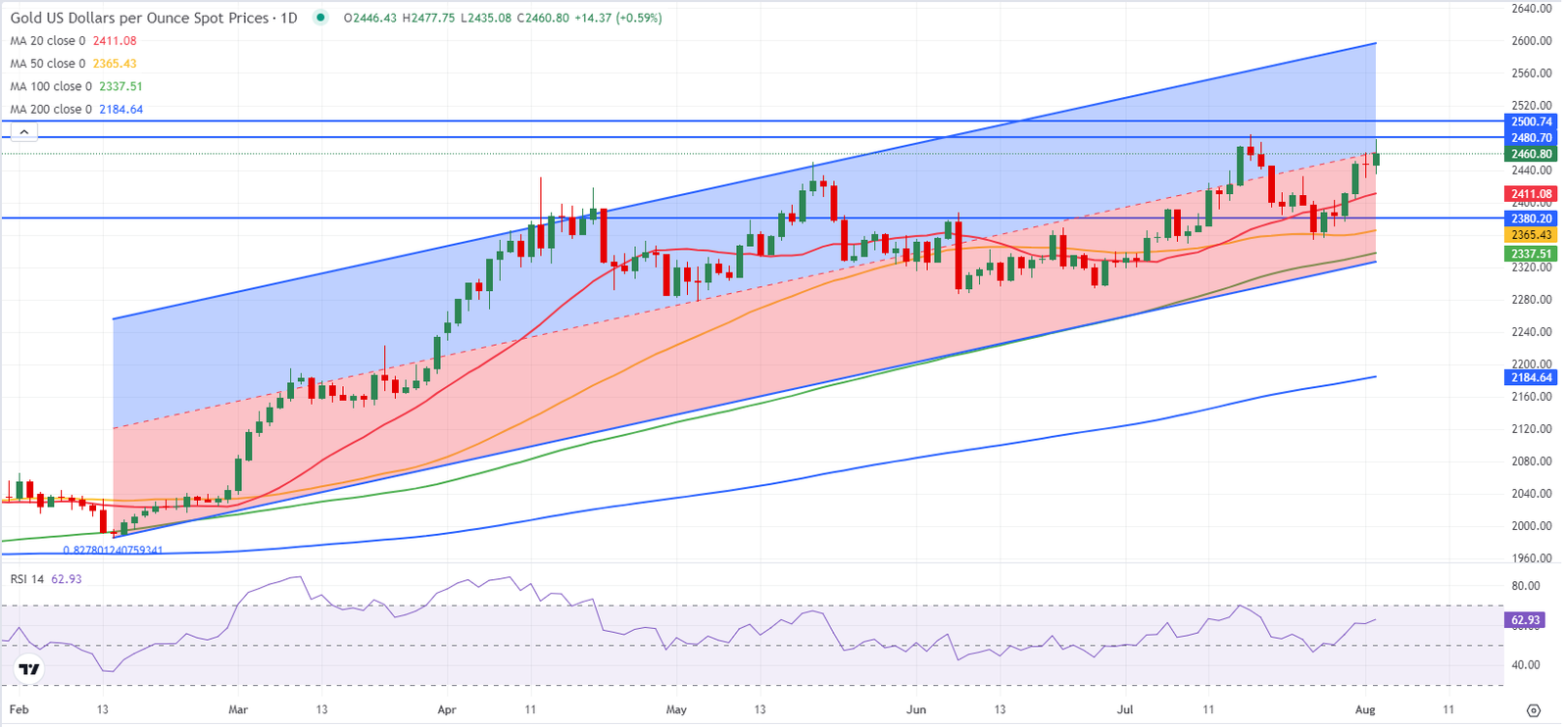 تسببت بيانات الاقتصاد الكلي المخيبة للآمال من الولايات المتحدة في انخفاض عوائد سندات الخزانة الأمريكية بشكل أكبر في النصف الثاني من الأسبوع. مع انخفاض العائد على السندات لأجل 10 سنوات إلى أقل من 4٪ للمرة الأولى منذ أوائل فبراير/شباط، استأنف الذهب تحقيق مكاسبه الأسبوعية وارتفع فوق 2460 دولارًا. ارتفع عدد المتقدمين بطلبات للحصول على إعانات البطالة لأول مرة في الولايات المتحدة إلى أعلى مستوياته منذ أغسطس/آب 2023 وبلغ 249 ألفًا في الأسبوع المنتهي في 27 يوليو/تموز، وانخفض مؤشر ISM لمديري المشتريات التصنيعي (PMI) إلى 46.8 في يوليو من 48.5 في يونيو/حزيران، مما يعكس تسارعًا في الانكماش المستمر في النشاط التجاري لقطاع التصنيع.
