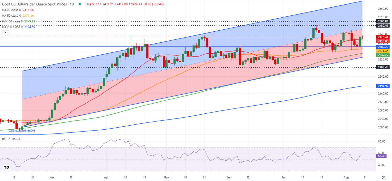 عانى الذهب (زوج الذهب/الدولار الأمريكي XAU/USD) من خسائر فادحة في بداية الأسبوع حيث أدت مجموعة من العوامل إلى عمليات بيع واسعة في السوق. ومع ذلك فقد تعافى المعدن الثمين بشكل حاد في النصف الثاني من الأسبوع واستقر فوق المستوى السعري البالغ 2400 دولار. ينتظر المشاركون في السوق بيانات التضخم لشهر يوليو/تموز من الولايات المتحدة للحصول على أدلة على الاتجاه التالي.