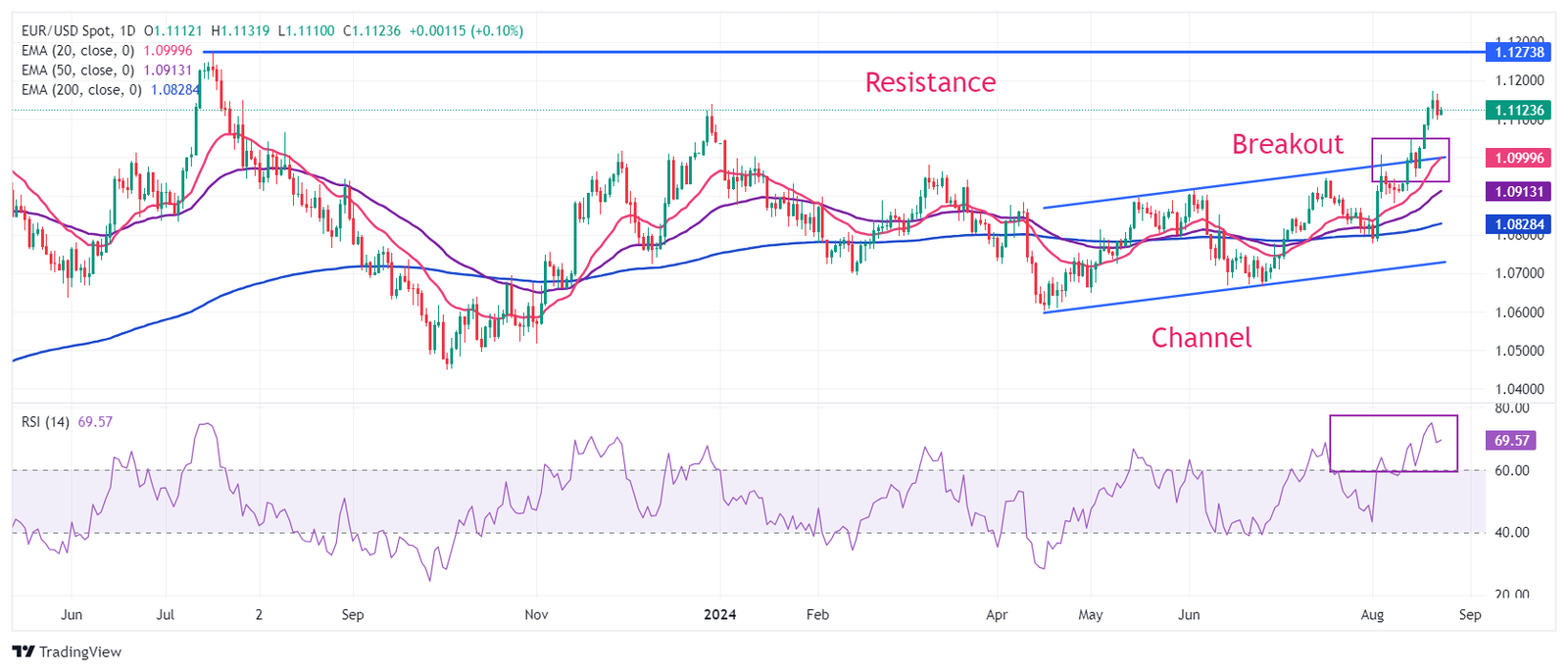 يستقر زوج يورو/دولار EUR/USD فوق مستوى الدعم الحرج البالغ 1.1100، مع تركيز المستثمرين على خطاب بنك الاحتياطي الفيدرالي باول في ندوة جاكسون هول. ظلت توقعات زوج العملة المشتركة متفائلة بعد اختراق تشكيل القناة على إطار زمني يومي. جميع المتوسطات المتحركة الأسية قصيرة إلى طويلة الأجل (EMAs) تميل صعودًا، مما يشير إلى اتجاه صعودي قوي.