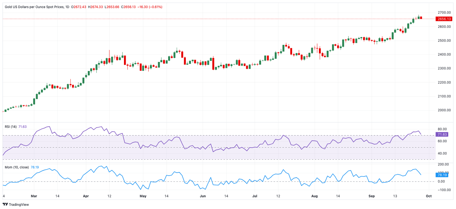 ظل الارتفاع في المعدن الثمين مدعومًا، أولاً: بتوقعات ثابتة بتخفيضات إضافية في أسعار الفائدة من قبل الاحتياطي الفيدرالي (Fed) في الاجتماعين المقبلين وحتى عام 2025، وثانيًا: المخاوف الجيوسياسية المستمرة النابعة بشكل رئيسي من الشرق الأوسط، في حين أن الصراع الروسي الأوكراني يضيف أيضًا إلى هذه المشكلة.