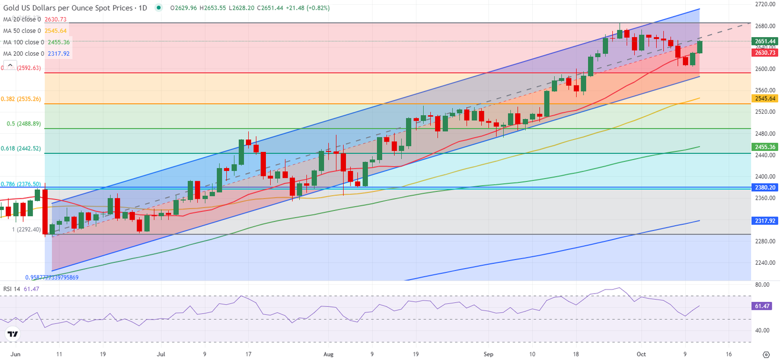 في الاتجاه الصعودي، تقف نقطة الوسط لقناة الميل الصاعد القادمة من يونيو/حزيران كمقاومة فورية عند 2660 دولارًا قبل 2675 دولارًا (مستوى ثابت) و2700 - 2710 دولار (حاجز حرج، الحد العلوي للقناة الصاعدة).