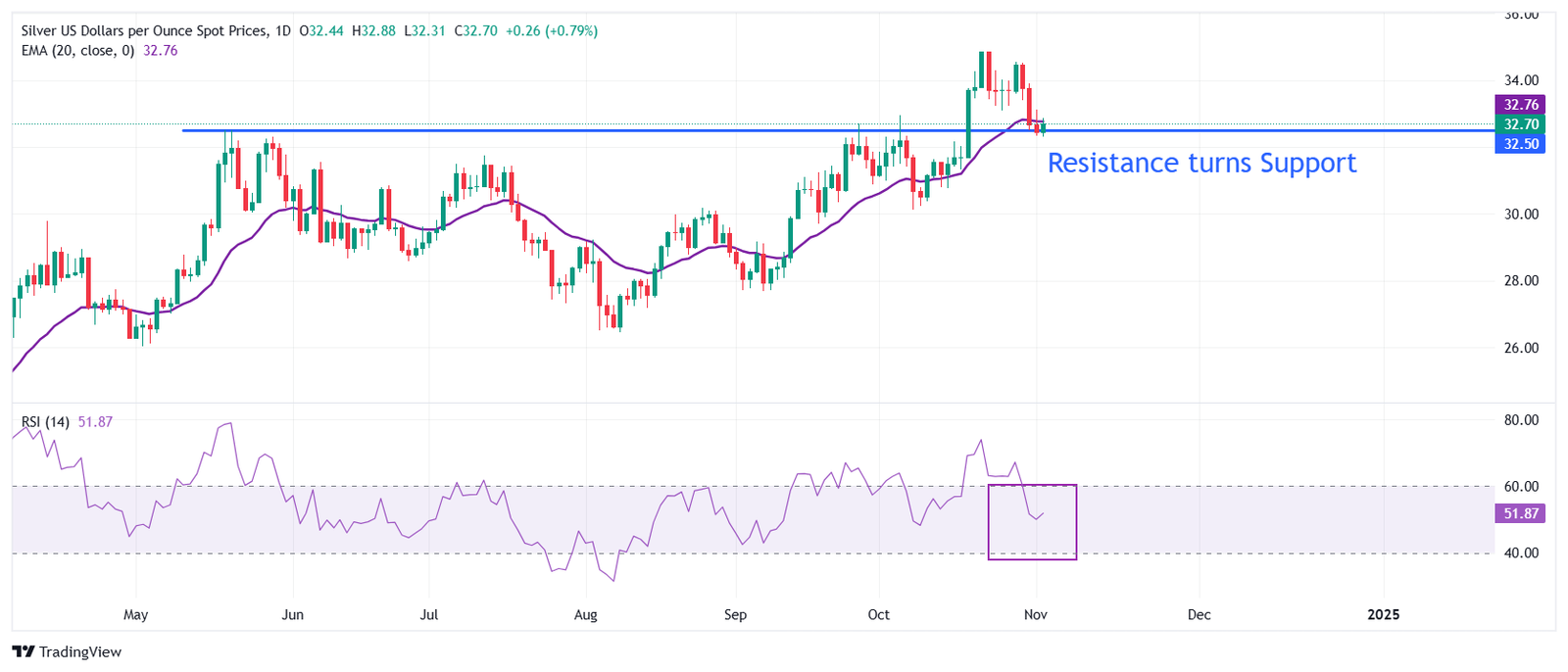 ارتفع سعر الفضة (زوج الفضة/الدولار XAG/USD) إلى ما يقرب من 33.00 دولار في جلسة التعاملات الأمريكية يوم الاثنين. ارتفع المعدن الأبيض مع انخفاض عوائد سندات الخزانة الأمريكية، مع تحول المستثمرين إلى القلق قبل الانتخابات الرئاسية الأمريكية يوم الثلاثاء.